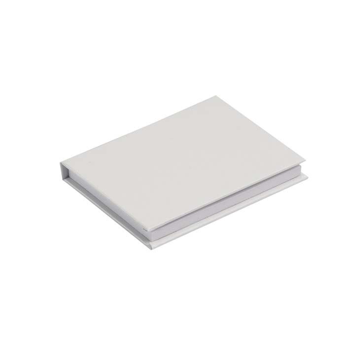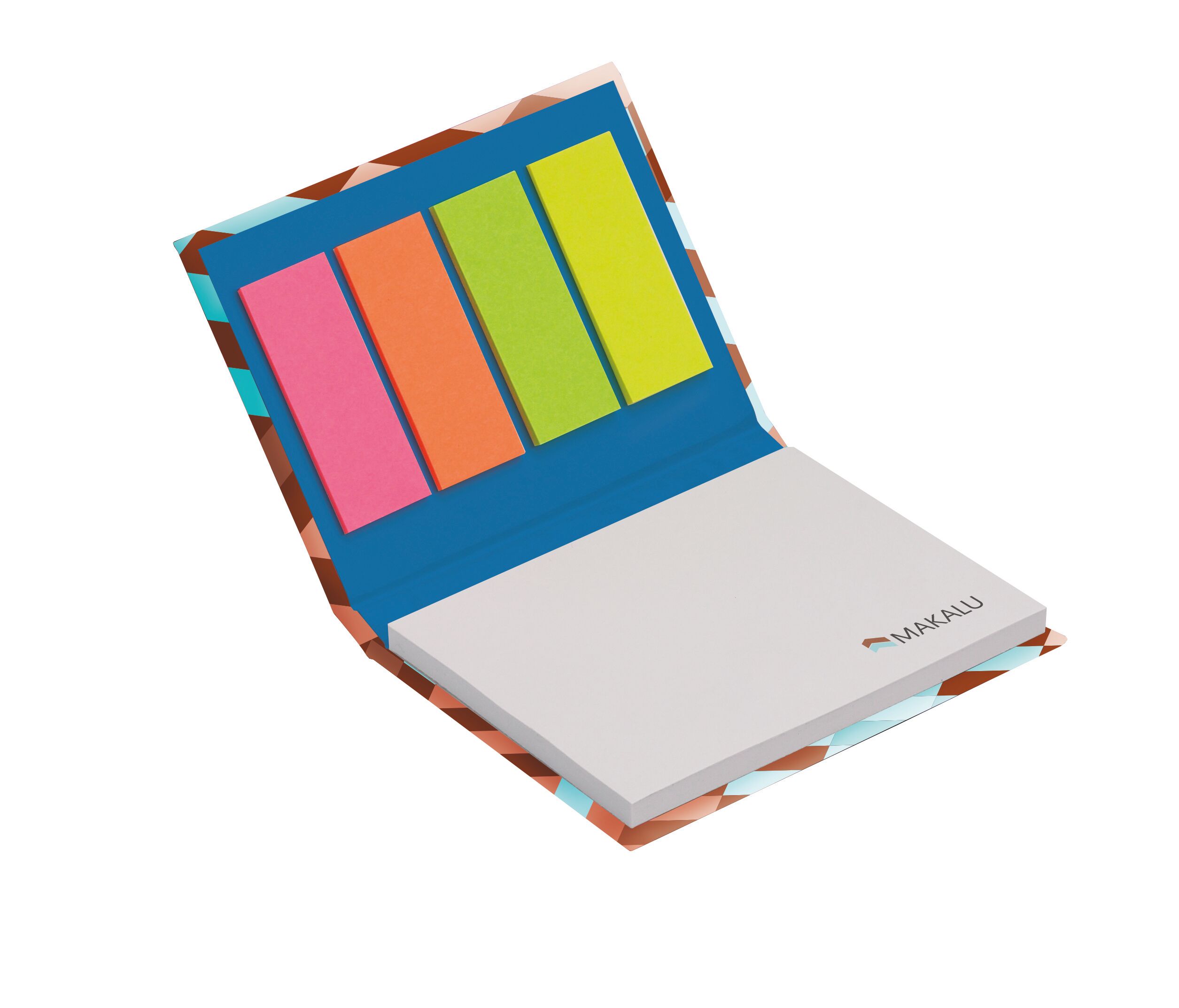 Bloco de notas em papel laminado de capa dura com 50 notas autocolantes e 15 marcadores em 4 cores.
