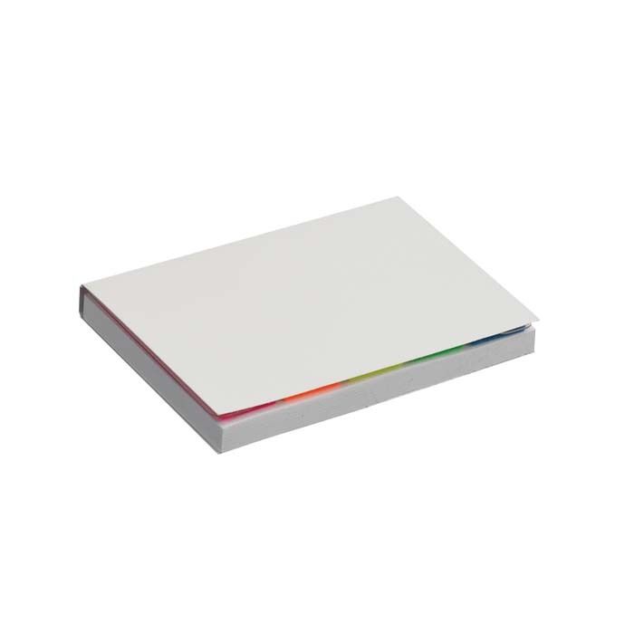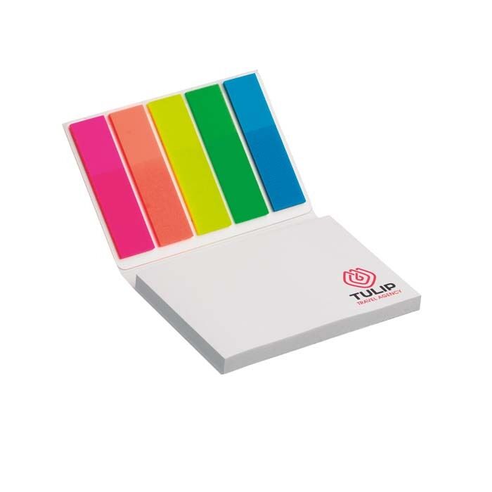 Bloco de notas em papel laminado de capa mole com 50 notas autocolantes e 20 marcadores em 5 cores.